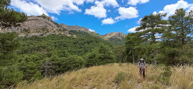 Regresamos hasta enlazar de nuevo con el del Collado de los Aserradores, en esta ocasión lo seguimos en dirección descendente por el tramo del Camino del Poyo de Juan Domingo hasta llegar al cruce donde parte el sendero de bajada Cerrada del Pintor, el tramo alto es una delicia, un viejo camino de Mackay que se conserva en bastante buen estado, la parte que continúa después del cruce se ha convertido en una pista transitable y ha perdido la esencia de los viejos caminos, aún así nos sorprende con regalos visuales a modo de mirador natural, un puntalillo por el tramo del Camino del Pilón del Ahogado ofrece unas vista privilegiadas al entorno de la Cerrada del Pintor,